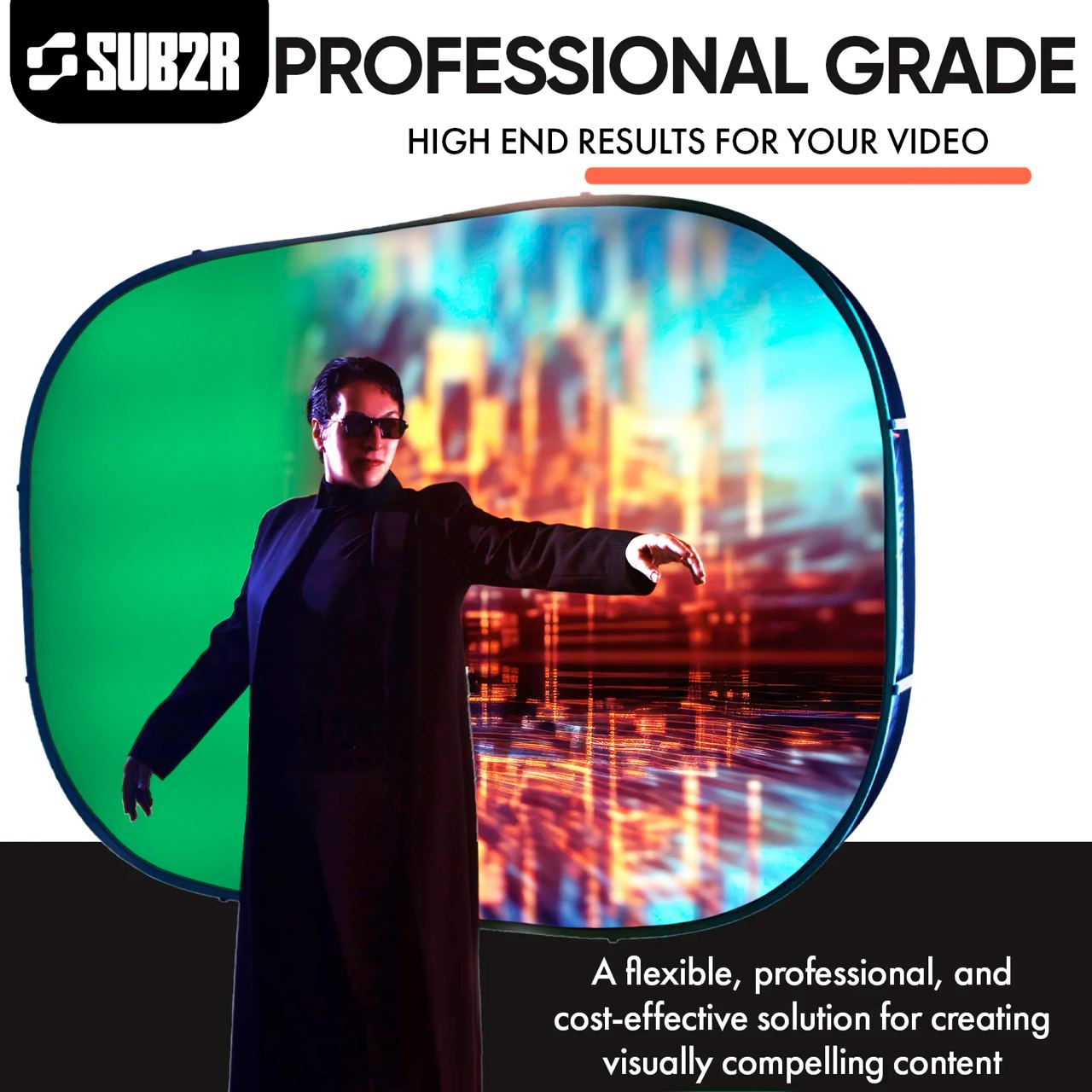 Makes using a green screen in ways never dreamed possible – on the beach, in a closet, on the ceiling, being held by a kid on a skate board