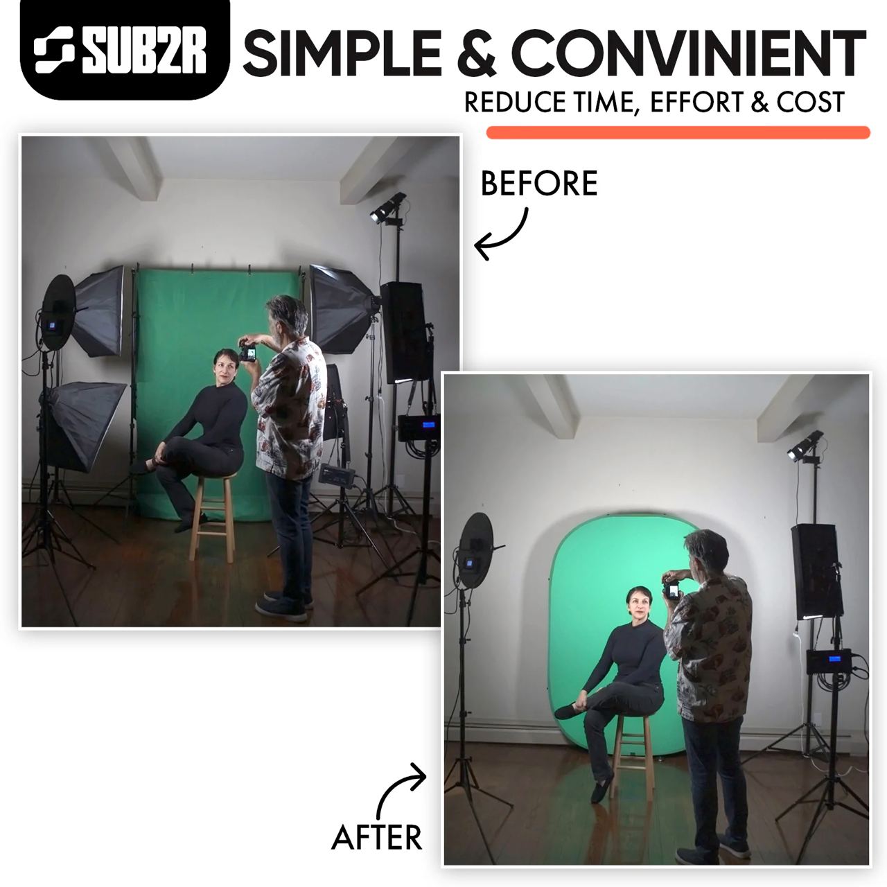 Because the AGS is self-illuminating, there is no need for dedicated green screen lights and the traditional space between the green screen and the subject you would normally need. Compose your scene, light your subject and then place AGS where you need it. Adjust the AGS to the lowest setting that achieves a good background for your chroma key to use.